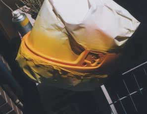 取り外せるパーツを全て取りはずしたら、マスキングしてすぐに塗ってしまいたくなるのだが、まず最初に下地処理を行う。 マスキングが出来たらいよいよスプレーの噴射だ、基本中の基本だが塗料は薄く何回かに分けて塗る。 |