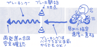 踏切-クランク-坂道-S字-外周-短制動-坂道発進までは普通二輪と全く同じ。この日最大の難関となったのが短制動である。 私を含め受検者全員(この手前で試験中止になった者を除く)が短制動をやり直しさせられた。原因は様々だが、私の場合は「ブレーキが早すぎる」と、言われた。 私がブレーキをかけ始めたのはブレーキ開始地点(右図の白いパイロン)に差し掛かると同時だったのだが、この日の試験官曰く「ブレーキはブレーキ開始地点を通過してから掛けなければならない」らしい。しかし、“ヤングマシン3月号別冊付録の2輪免許攻略ガイドの37ページ”によると“ブレーキングはバイク1台分手前からでもOK!”とはっきり書いてある(※下図参照)。 ![]() これは一体どういう事なのか?普通二輪試験の時はブレーキ開始地点より1メートル位手前でブレーキを開始したが、1回でOKだった。と、言うことはこの日の試験官のエゴなのだろうか、やり直しだけで10点減点なので、受検者にとってはたまったもんじゃない!私の場合は2回目でブレーキ開始地点を通過後にブレーキを掛け短制動はクリアした。 他の受検者は全員2回目の短制動で試験中止を通告されていた。2回目の短制動に入る際の外周を周るときにカーブでブレーキを掛けたり、障害物を越えるときの合図をしなかったり、やり直しを告げられ明らかにパニック状態になっていた。 |