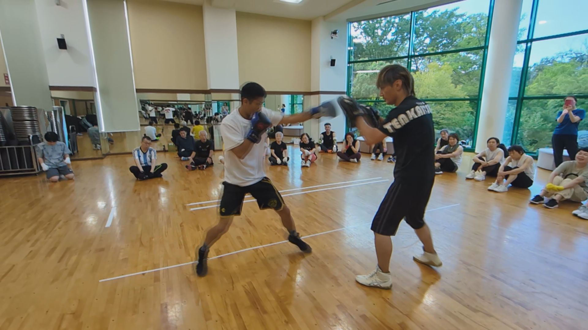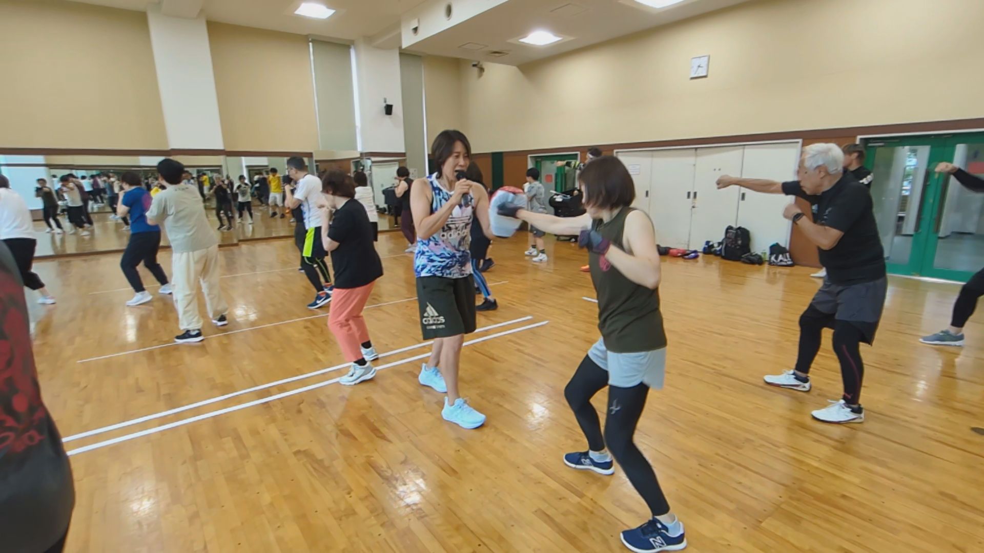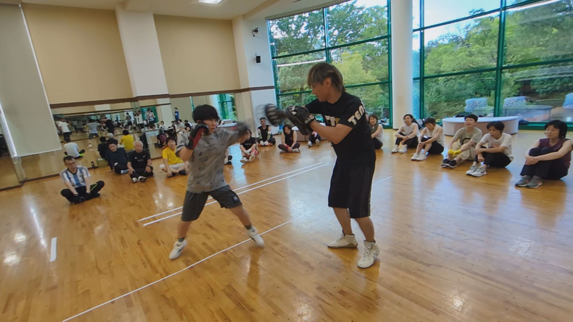 厚木ワタナベジムの佐藤香実選手がミット打ちを披露、プロボクサーのパワーとスピードに参加の皆さんを圧倒