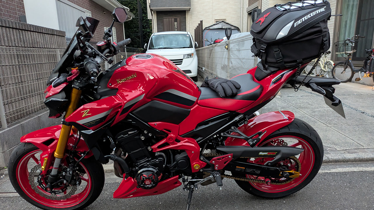 AM6時、革ツナギにネックウォーマーを巻き防寒グローブを装着し自宅を出発